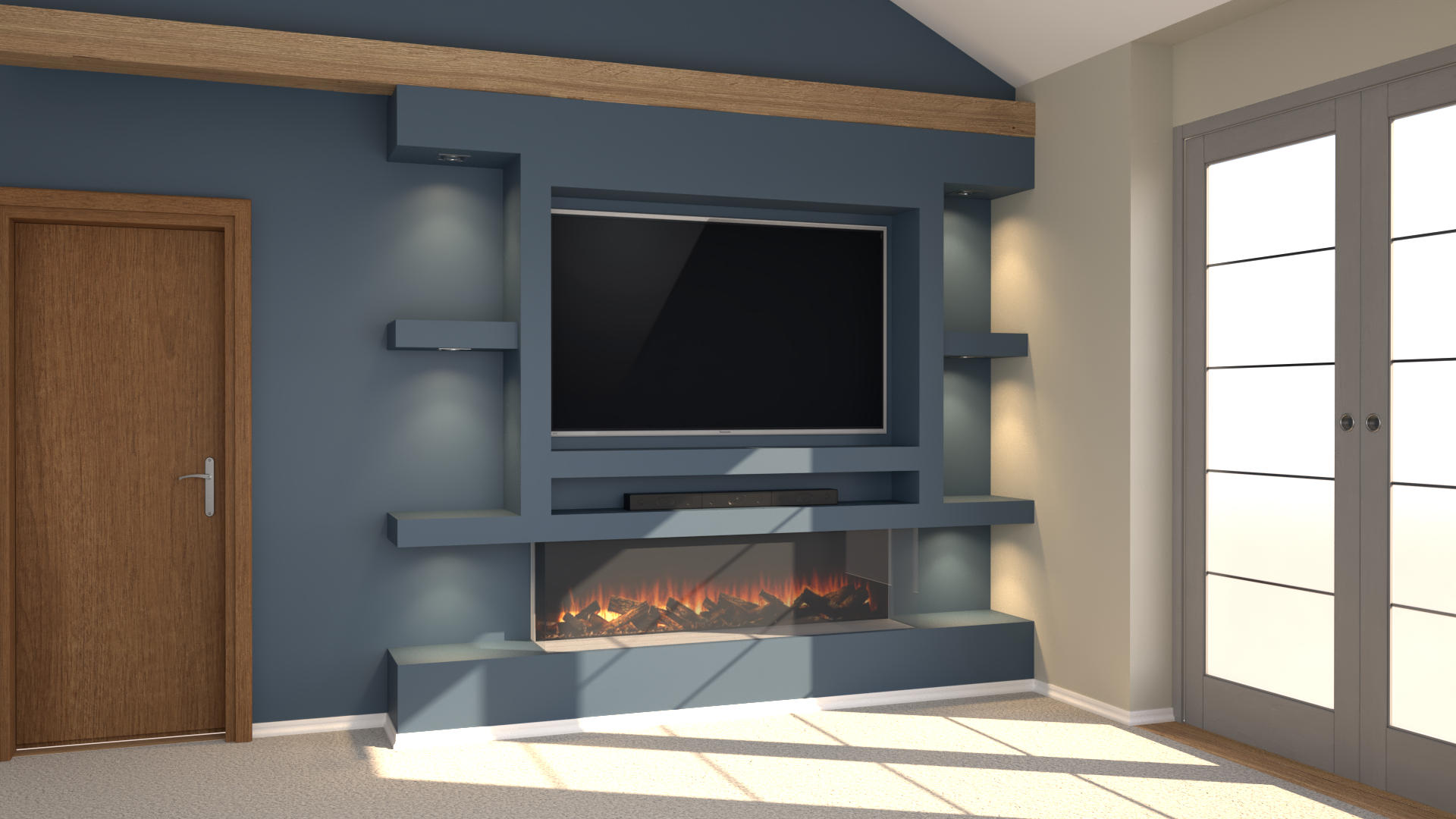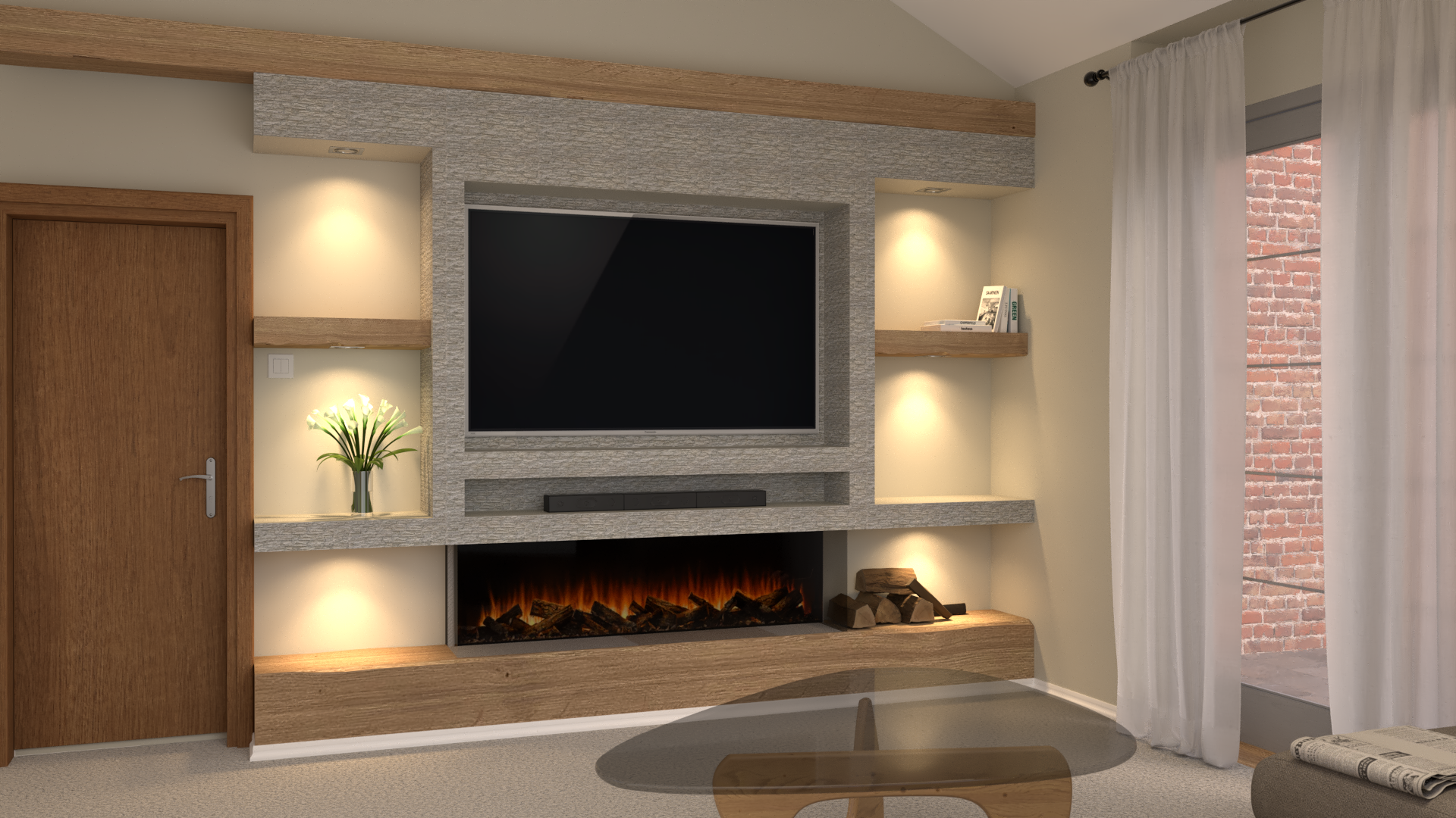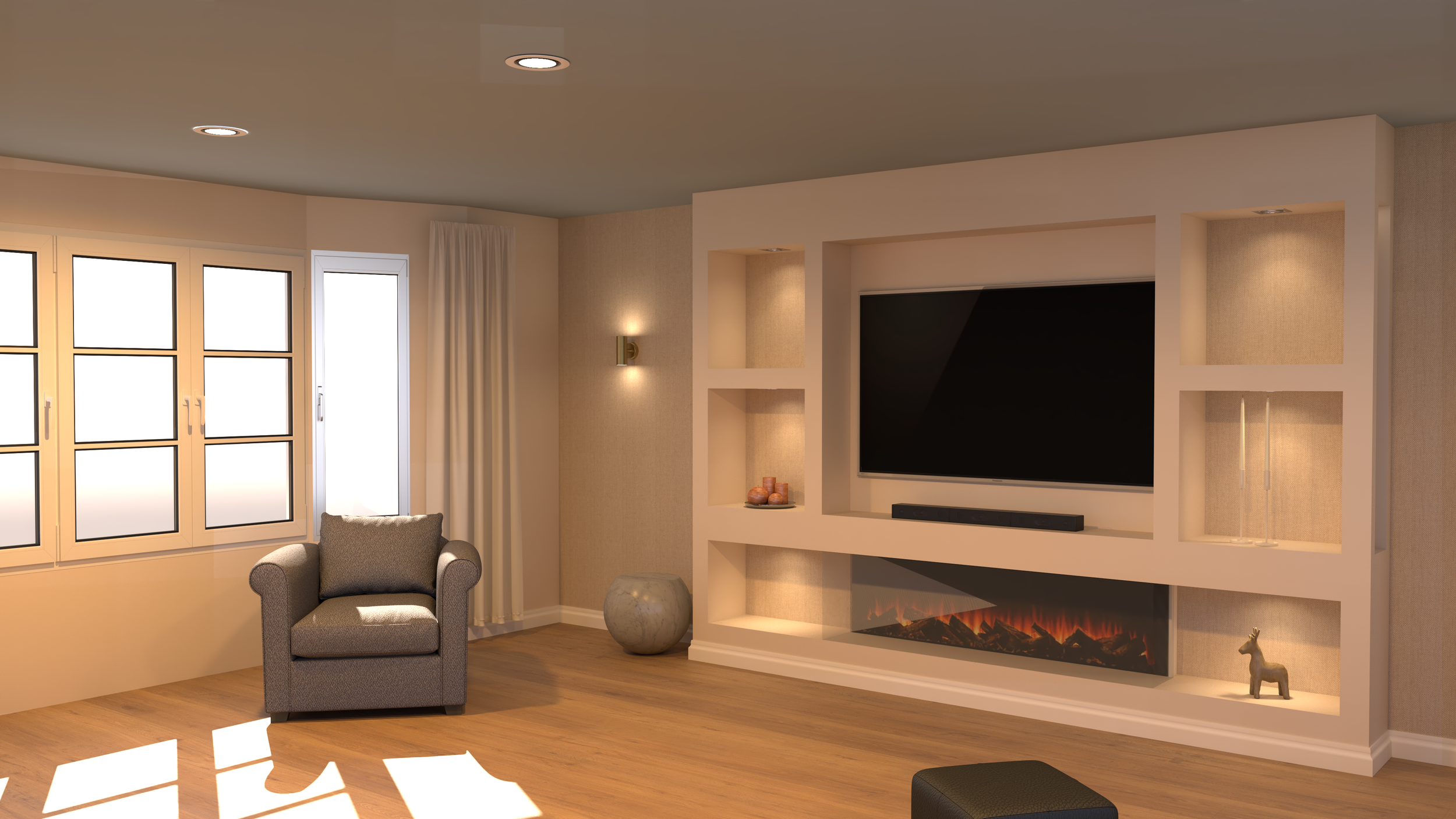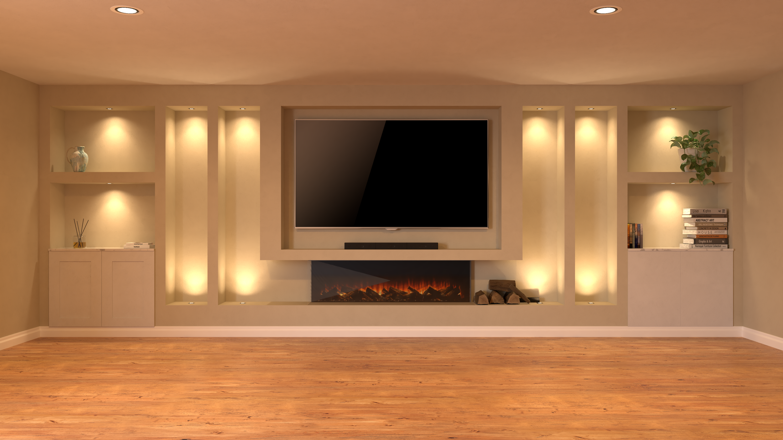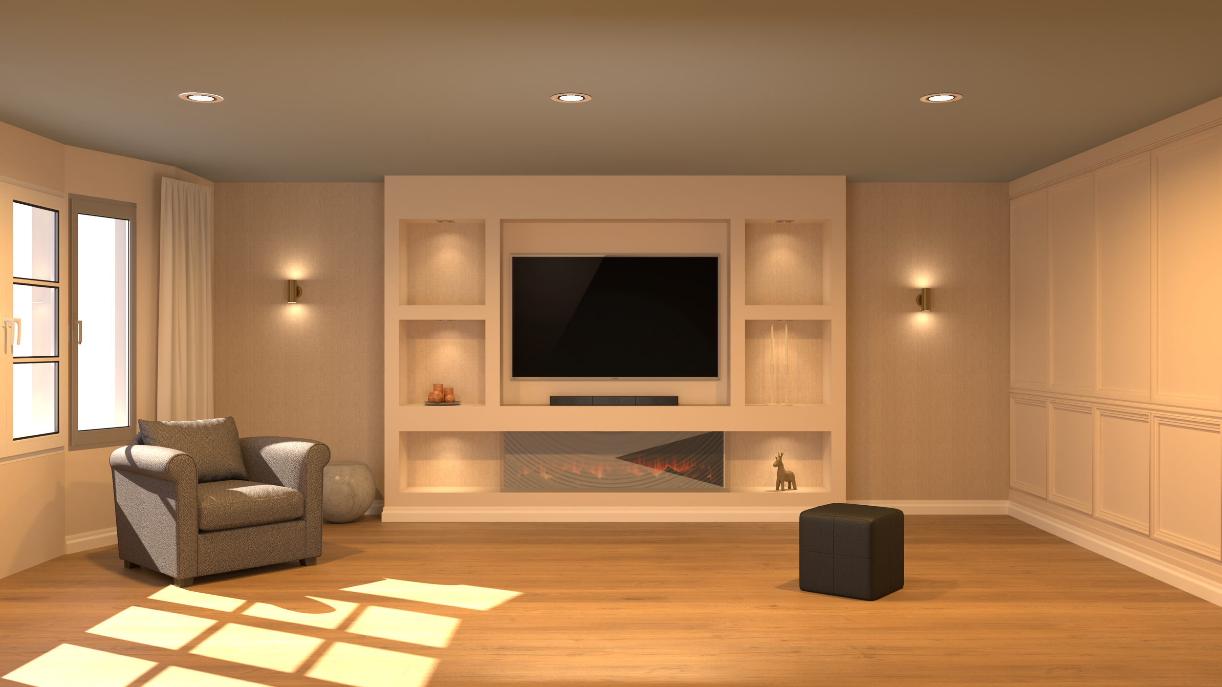 Digital rendering, on the other hand, is the visual stage where the CAD design is turned into a realistic image of the finished media wall. It shows materials, colours, lighting, and textures in a way that looks like a real-life photo, helping you understand how the final result will appear in your room. This stage focuses more on aesthetics, allowing you to experiment with different styles and finishes before anything is built.